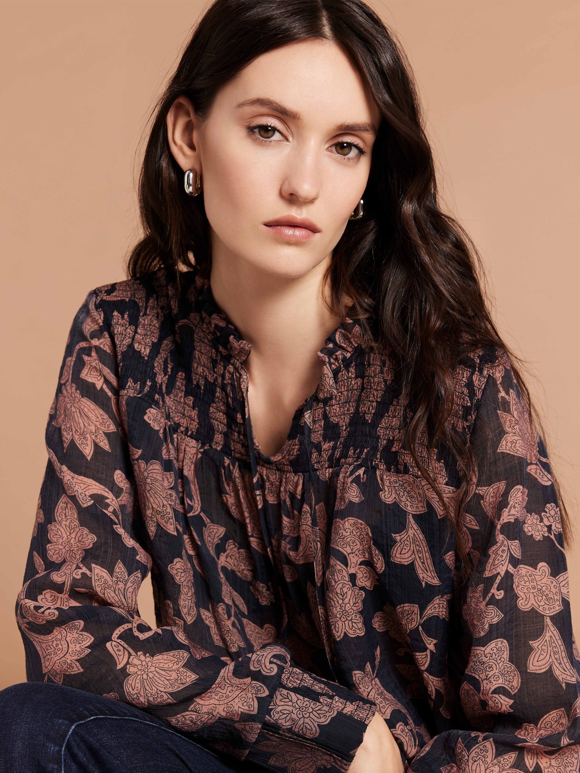 Effortlessly elevate your wardrobe with this beautiful Printed Voile Blouse. Featuring a delicate floral print, smocked details at the collar, and a charming tie-up neckline, it offers an elegant and comfortable fit. Perfect for a day at work or an evening out, this versatile blouse will make a stylish addition to any outfit.